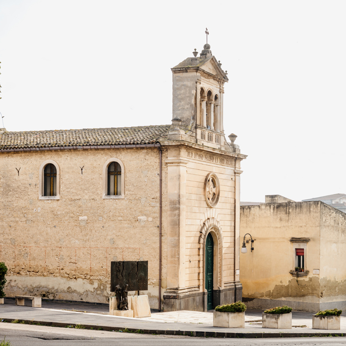 La Chiesa di San Rocco, già attestata nel 1726, fu edificata dai primi abitanti di Occhiolìs che si stabilirono nel quartiere più antico di Grammichele. Inizialmente era una piccola costruzione: nello stesso sito dove si trova oggi la Chiesa, il Santissimo Sacramento fu custodito in una baracca, inviato dal Carafa per permettere la celebrazione delle funzioni religiose. La prima struttura di San Rocco fu dunque una cappella modesta, che nel 1830 venne ricostruita e ampliata. Il completamento della Chiesa risale invece agli anni Trenta del Novecento. L’esterno presenta un portale in legno finemente intagliato con varie decorazioni e, sopra di esso, un rosone che mostra il simbolo dell’Eucaristia. Nel secondo ordine, in alto, si legge l’iscrizione “DEO OPTIMO MAXIMO ET DIVO ROCHO”, che significa “A Dio sommo e massimo e a San Rocco”. L’interno è costituito da un’unica navata: sulla parete destra si trova una tela del 1877 che raffigura San Rocco, mentre sulla stessa parete si erge l’altare dedicato alla Madonna del Pericolo. La parete sinistra ospita invece un altare con un Crocifisso in legno. Di particolare interesse è anche la piazzetta davanti alla Chiesa, dove si trovano un grande pannello in bronzo che racconta l’esodo degli abitanti di Occhiolìs verso Grammichele, una statua dedicata a Fra Michele da Ferla e un prezioso orologio solare.